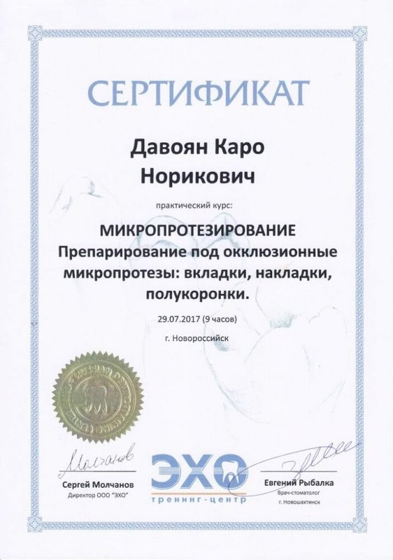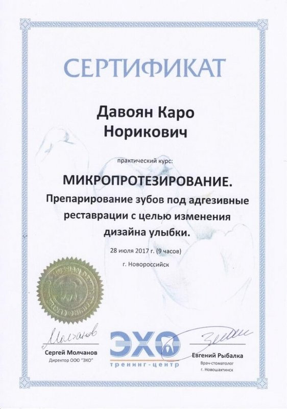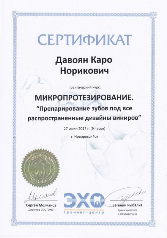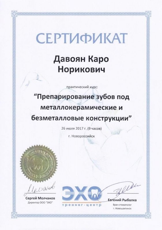 Каро Норикович является главным врачом клиники ДентЭстетик. Специализируется на комплексной реабилитации улыбки и ведет прием по ортопедической стоматологии, а именно: все виды съемного и несъемного протезирования с опорой на зубы и импланты, единичные коронки на зубы, эстетическая реконструкция улыбки с помощью виниров, а также использует в своей деятельности все современные способы планирования лечения и моделирования будущей улыбки. Консультирует по вопросам терапевтической стоматологии, занимается лечением и реставрацией зубов.